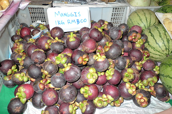 4點左右回到飯店。6點又出門到市區去吃海鮮,這海鮮餐廳旁邊就是一個傳統市場,導遊還讓我們先到市場中去逛一逛買東西,主要就是要買台灣好久不見的果后山竹,在那個市場中幾乎每一攤都一樣價格:一公斤3元馬幣,相當台幣30元,我們就很快樂的買了3公斤回飯店吃,但後來證明我們還是買太少了。山竹這東西真的很好吃,很難形容的味道,酸酸甜甜的但又很好入口,多年前台灣有進口,後來好像因為有病蟲害的原因所以就被禁止了。另外山竹的汁液是洗不掉的,所以要很小心不要被沾上,也被規定不可以在飯店床上或床邊吃。選山竹有技巧的,導遊說要選有6瓣的肉比較多籽比較小