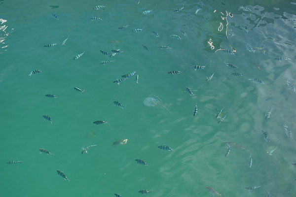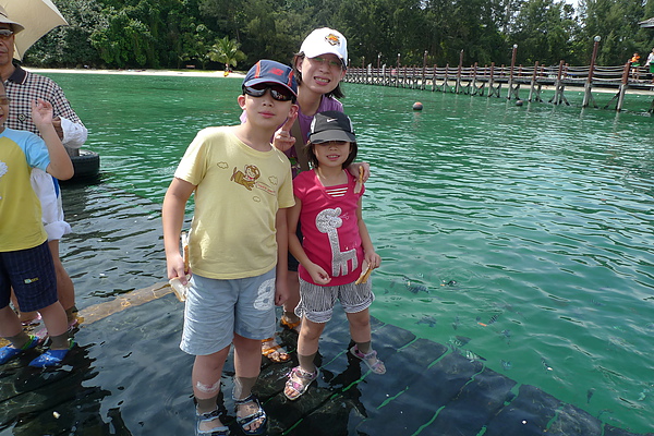 中午就在小島上沙灘旁吃露天 buffet,然後在回程繞到另一個離島去去餵魚‧這也是一個設計得很好的地方,船停的碼頭旁邊就一大堆熱帶魚,然後碼頭有一大段是在水下約10公分左右,也就是腳泡在水中餵魚,魚就在腳邊游,導遊也準備了一大堆的土司讓我們餵,這種離海水中的熱帶魚這麼近的體驗,以前我只夏威夷的恐龍灣有遇到過。